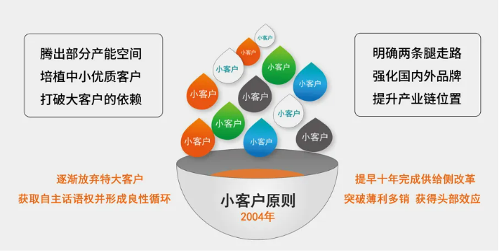 因此,“雙童”推出了小訂單策略,做出規(guī)定:要求業(yè)務(wù)員逐步放棄沒有利潤的大客戶,騰出產(chǎn)能空降培植日本和歐盟的中小客戶;拓展國內(nèi)高端市場和個性化定制,形成“兩條腿走路”布局;每個客戶的訂貨數(shù)量絕不允許超過本廠生產(chǎn)總量的5%。