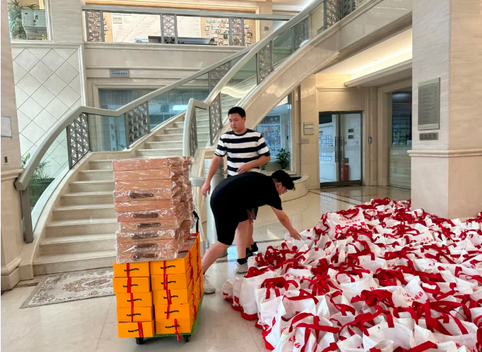 中秋節(jié)雖然還沒有來臨,但后勤部門一早就已經(jīng)開始了熱火朝天的準(zhǔn)備工作,將一盒盒精心準(zhǔn)備的月餅、水果、吸管禮盒、雙童文創(chuàng)裝入禮品袋中。