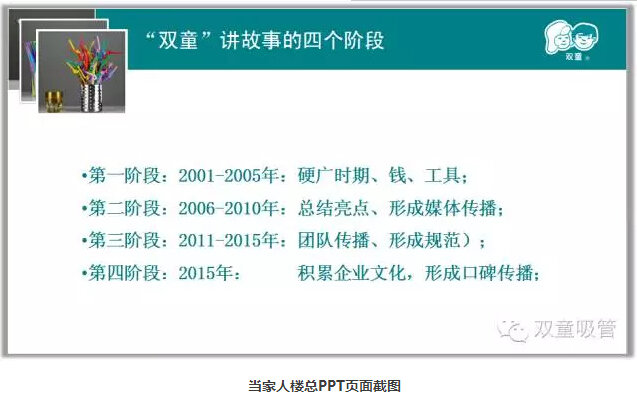 而“雙童”在品牌推廣的過程中,其實(shí)也是分階段的。從硬廣時(shí)期,每年投入200多萬元做廣告,到后來的塑造差異化亮點(diǎn),引導(dǎo)媒體給“雙童”講故事,再到成立文宣部門,形成團(tuán)隊(duì)“講故事”,最后達(dá)到形成企業(yè)文化,形成口碑傳播。這是一條漫長的道路,需要“雙童”人持之以恒的堅(jiān)持和努力!