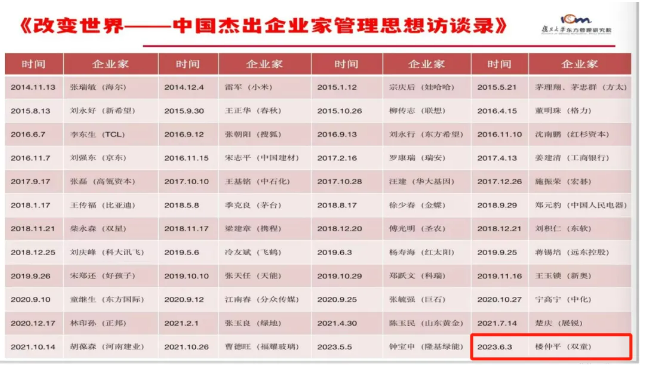 自2014年《改變世界》項(xiàng)目啟動(dòng),上海第一財(cái)經(jīng)頻道還同步推出了同名系列專題片訪談,近10年時(shí)間共采訪了50位中國各行各業(yè)影響力頗深的企業(yè)家,通過深度訪談,薈聚中國式管理的思想精粹,向世界管理論壇傳遞中國的聲音!