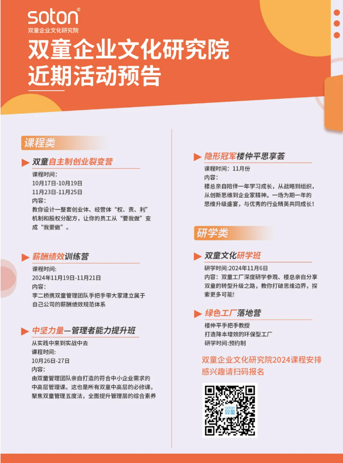 從樓總的分享中,我們能清晰地感知到,他一直在尋求破界、創(chuàng)新,每當(dāng)企業(yè)趨于穩(wěn)定時(shí),他就會扮演“攪局者”的角色,打破現(xiàn)有的平衡。也正是創(chuàng)始人這種“于無聲處聽驚雷”的未雨綢繆,才能讓雙童在每次危機(jī)來臨時(shí),都能成功“闖關(guān)”,穿越一個(gè)個(gè)成長周期!