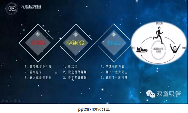 第二個(gè)關(guān)鍵詞就是我們的習(xí)慣啦!你們有試過(guò)21天養(yǎng)成一個(gè)習(xí)慣嗎?一聽(tīng)到這個(gè)問(wèn)題,童鞋們也分享起了自己的經(jīng)歷。有的已經(jīng)形成了習(xí)慣,有的只堅(jiān)持了幾天就放棄了。其實(shí)習(xí)慣的養(yǎng)成都會(huì)經(jīng)歷三個(gè)階段:反抗期、不穩(wěn)定期、倦怠期。如何度過(guò)這三個(gè)階段養(yǎng)成習(xí)慣呢?妞就把干貨PPT放上來(lái)與大伙共享吧!
