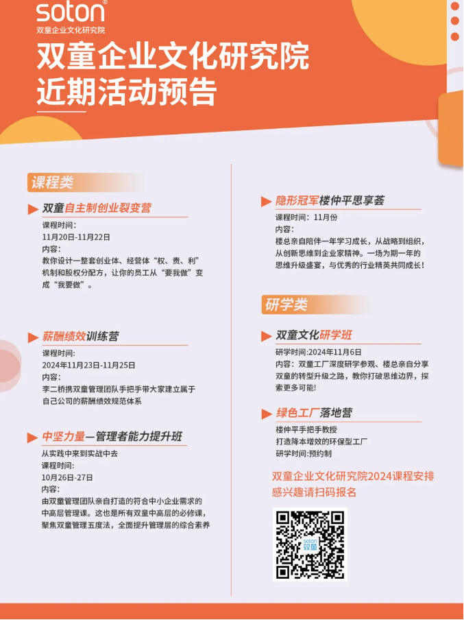 隨著“雙童”案例的廣泛傳播,自主制創(chuàng)業(yè)裂變機制也逐漸被越來越多研究者調(diào)研。為了造福更廣大的中小企業(yè),雙童商學院精心打造的自主制裂變營課程,目前已經(jīng)發(fā)展得相當成熟,具備可復制性和可實踐性,完全契合中小微創(chuàng)業(yè)者的需求。