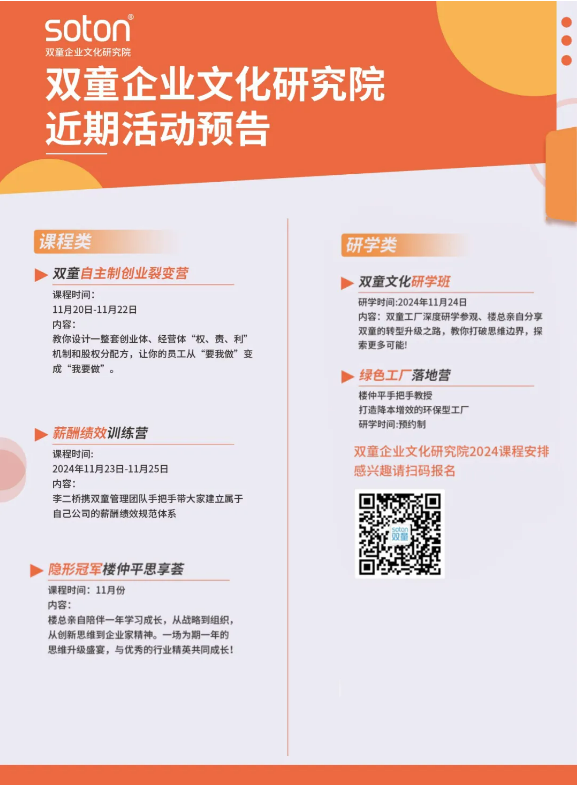 如果你也對“雙童”充滿好奇,也想賦能團隊共同成長,歡迎走進11月24日【雙童文化研學(xué)班】,與上百位優(yōu)秀的創(chuàng)業(yè)者一起學(xué)習(xí)!少量名額,歡迎咨詢鎖定!