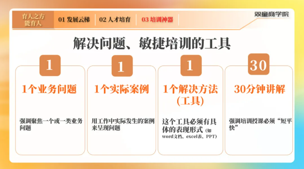 清晰的發(fā)展路徑能夠增加員工留下來的意愿。所以程老師建議管理者們建立完善的員工發(fā)展云梯,比如按照專業(yè)管理、專業(yè)技術(shù)、生產(chǎn)操作和業(yè)務(wù)等不同類別設(shè)計清晰的上升路徑。同時在新人上升的不同階段,要及時給與對應的幫扶與賦能。程老師也在課上給到了實際操作方法和“11130”模型培訓神器,讓同學們隨學隨用。