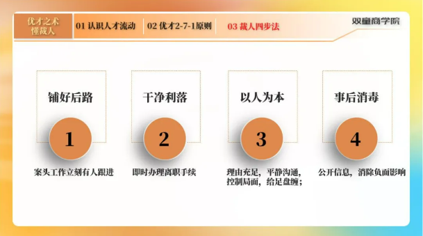 但是,程老師告訴大家一旦選擇優(yōu)才,必須要提前做好接頭工作,并且做好善后工作,消除負面影響,具體的裁人步驟可分為:鋪好后路-干凈利落-以人為本-事后消毒,將消極影響降到最低!