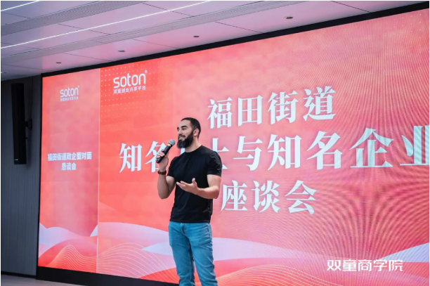 座談會的最后階段,作為福田街道杰出的企業(yè)家代表,來自埃及的雷鋒果汁創(chuàng)始人穆罕默德從自身企業(yè)經(jīng)營狀況出發(fā),圍繞產(chǎn)品創(chuàng)新、銷售模式等話題發(fā)表了自己的經(jīng)驗看法。