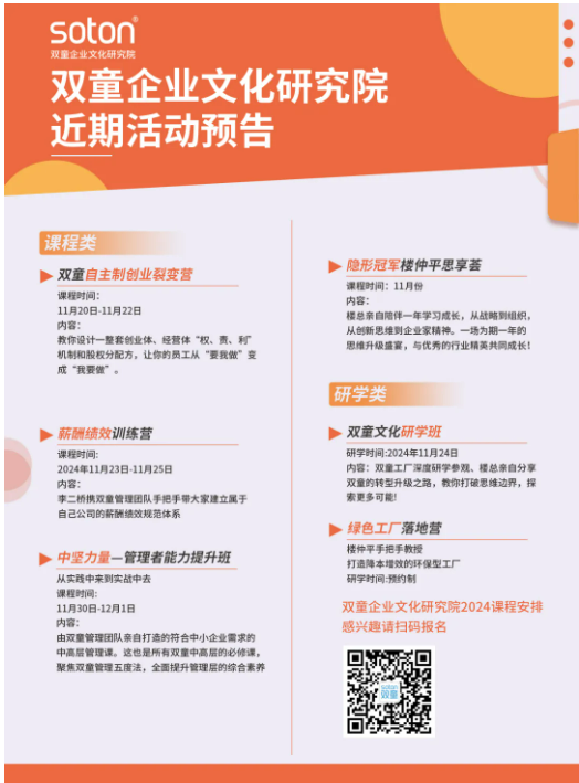 如果你也對“雙童”充滿好奇,也想賦能團隊共同成長,歡迎走進11月24日【雙童文化研學班】,與上百位優(yōu)秀的創(chuàng)業(yè)者一起學習!少量名額,歡迎咨詢鎖定!