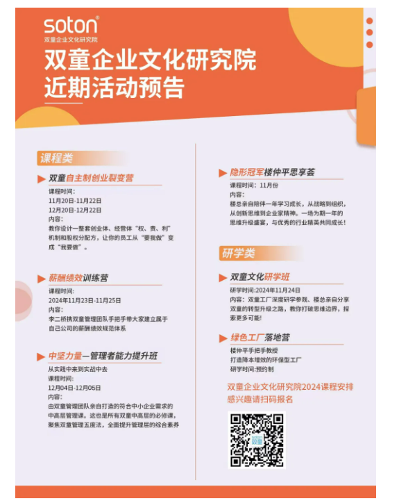 如果你也對(duì)“雙童”充滿好奇,也想賦能團(tuán)隊(duì)共同成長(zhǎng),歡迎走進(jìn)11月24日【雙童文化研學(xué)班】,與上百位優(yōu)秀的創(chuàng)業(yè)者一起學(xué)習(xí)!少量名額,歡迎咨詢鎖定!