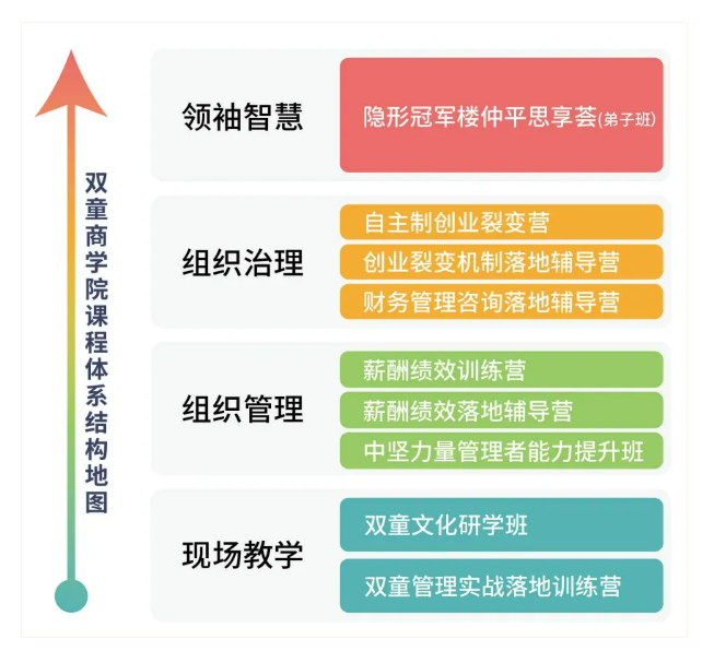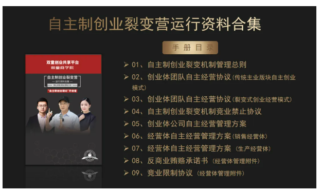 3)組織治理模塊:《自主制創(chuàng)業(yè)裂變營》專注于組織機(jī)制創(chuàng)新,幫助學(xué)員輸出一套企業(yè)組織創(chuàng)新方案,激發(fā)個體活力,推動企業(yè)裂變式增長。