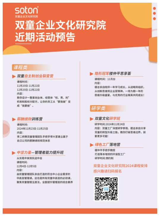 4)領(lǐng)袖智慧模塊:《隱形冠軍樓仲平思享薈》通過樓仲平老師的全年深度教學(xué)及雙童“中國式管理體系”輸出,致力于培養(yǎng)更多中國隱形冠軍企業(yè),實現(xiàn)企業(yè)家的認(rèn)知升級、實戰(zhàn)落地。