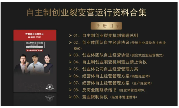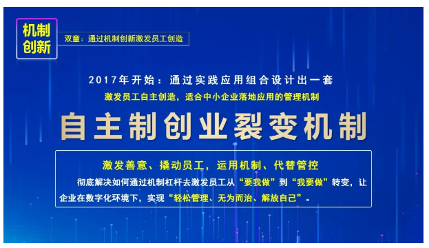 于是他果斷選擇破界創(chuàng)新,尋求企業(yè)發(fā)展的“第二曲線”,并結(jié)合多種組織機制和中小企業(yè)的特點,自制了一套適用于中小企業(yè)的組織創(chuàng)新制度——自主制創(chuàng)業(yè)裂變機制,搭建創(chuàng)業(yè)共享平臺,激發(fā)員工從“要我做”到“我要做”。