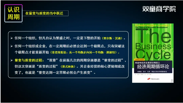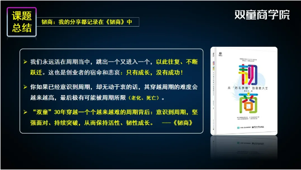 雙童30年穿越一個個越來越難的周期背后,是創(chuàng)始人樓仲平在周期來臨之前,就意識到了新周期,然后帶領(lǐng)企業(yè)堅強(qiáng)面對、持續(xù)突破,從而讓雙童保持活性、韌性成長!所以在分享的最后,樓總再次勸誡各位創(chuàng)業(yè)者:我們永遠(yuǎn)活在周期當(dāng)中,跳出一個又進(jìn)入一個,以此往復(fù)、不斷躍遷。如果你已經(jīng)意識到周期,卻無動于衷的話,其穿越周期的難度會越來越高,最后極有可能被周期所限(老化、死亡)!