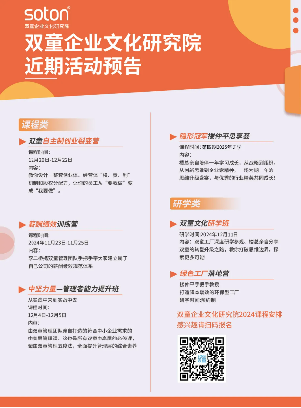 個體的進(jìn)化是組織進(jìn)化的前提,創(chuàng)業(yè)者的“成長活性”驅(qū)動著企業(yè)的“成長活性”。所以樓仲平個人的持續(xù)進(jìn)化,也推動了雙童這家企業(yè)在30年間,不斷穿越一個個經(jīng)營周期,并持續(xù)充滿活力!