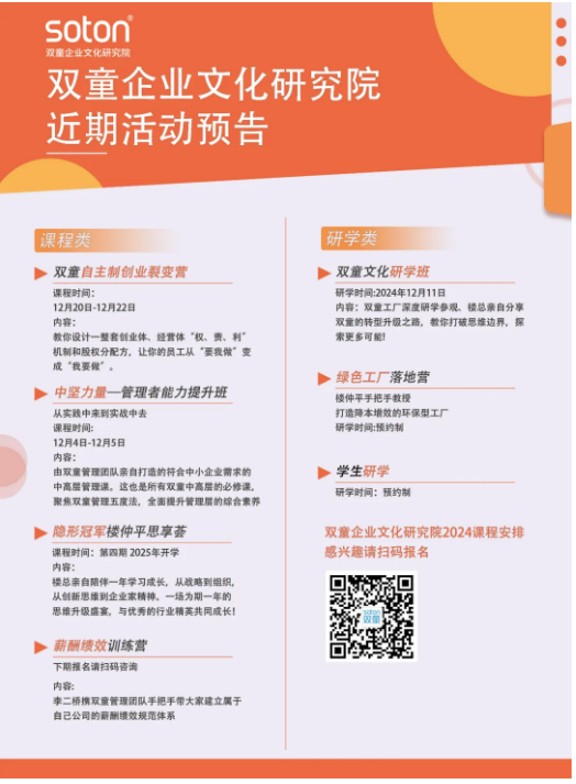 如果你也對“雙童”充滿好奇,也想賦能團隊共同成長,歡迎走進12月11日【雙童文化研學(xué)班】,與上百位優(yōu)秀的創(chuàng)業(yè)者一起學(xué)習(xí)!少量名額,歡迎咨詢鎖定!
