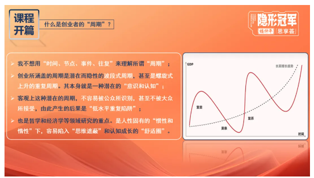 在良好的課堂氛圍下,樓老師的知識(shí)分享格外激情澎湃。為了讓大家更好地理解主題,在課程伊始,樓老師闡釋了“創(chuàng)業(yè)者周期”的定義,創(chuàng)業(yè)所涵蓋的周期是潛在而隱性的波段式周期,甚至是螺旋式上升的重復(fù)周期。