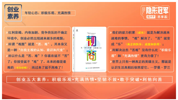 在本次課程的最后,樓仲平老師鼓勵(lì)大家不要悲觀,因?yàn)槿祟惥褪窃诔錆M波折和螺旋的周期中成長(zhǎng),從而不斷遇見(jiàn)更強(qiáng)大優(yōu)秀的自我!所以在創(chuàng)業(yè)五大素養(yǎng)中,樓老師認(rèn)為“積極樂(lè)觀”是最重要的素養(yǎng)。