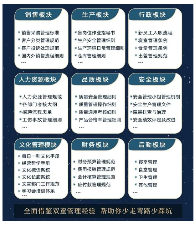 所以,入學(xué)“隱形冠軍樓仲平思享薈”之后,項(xiàng)目組會(huì)將“雙童”積累了30年、包含了銷售、生產(chǎn)、行政、人力資源、品質(zhì)、安全、文化管理、財(cái)務(wù)和后勤等9大板塊,近600份管理規(guī)范文件,全部打包給學(xué)員,幫助學(xué)員企業(yè)能夠全面借鑒雙童管理經(jīng)驗(yàn)、少走彎路、少踩坑!