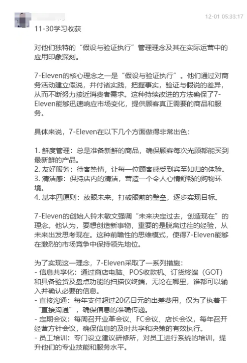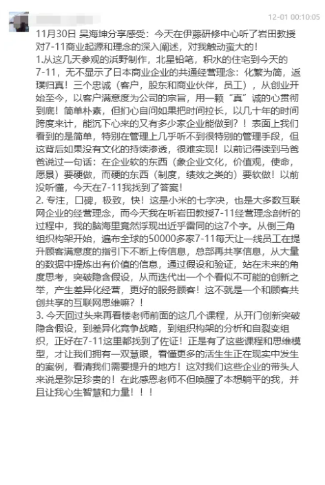 或許當(dāng)時(shí)大家對(duì)充滿哲科思維的課程內(nèi)容還有充滿疑惑,但當(dāng)親眼看到、親身體會(huì)到7-11集團(tuán)的成功時(shí),同學(xué)們一定理解了樓老師的用心,學(xué)習(xí)的意義在此刻形成了完美的閉環(huán)。