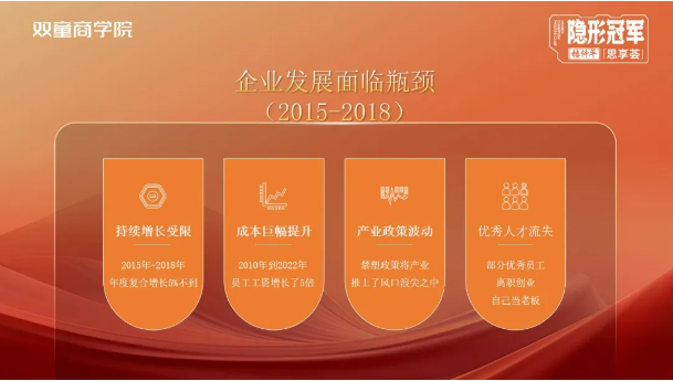 2015-2018年,雙童的發(fā)展進入了瓶頸期:持續(xù)增長受限,成本大幅度提升,產(chǎn)業(yè)政策造成了很大波動,優(yōu)秀人才的也開始流失。這些都是亟待解決的難題。