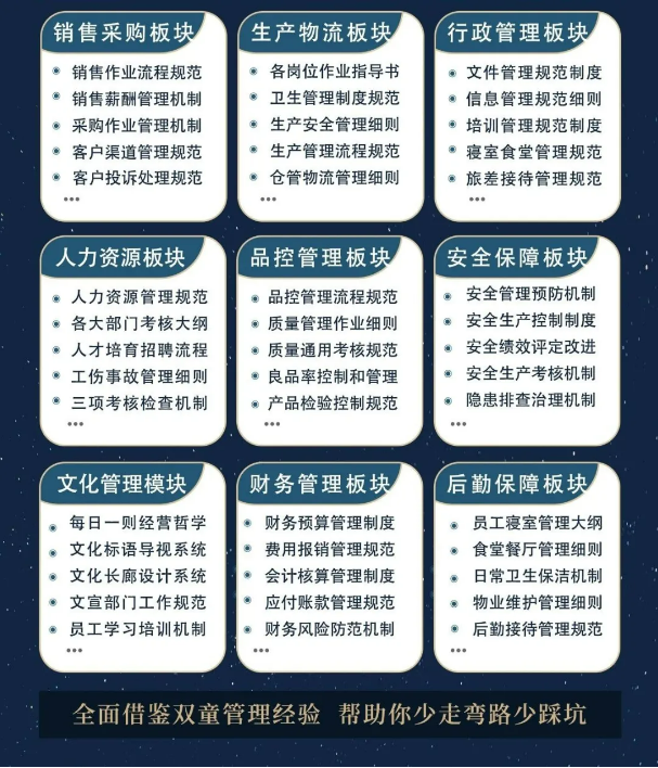 所以,入學“隱形冠軍樓仲平思享薈”之后,項目組會將“雙童”積累了30年、包含了銷售、生產(chǎn)、行政、人力資源、品質(zhì)、安全、文化管理、財務和后勤等9大板塊,近600份管理規(guī)范文件,全部打包給學員,幫助學員企業(yè)能夠全面借鑒雙童管理經(jīng)驗、少走彎路、少踩坑!
