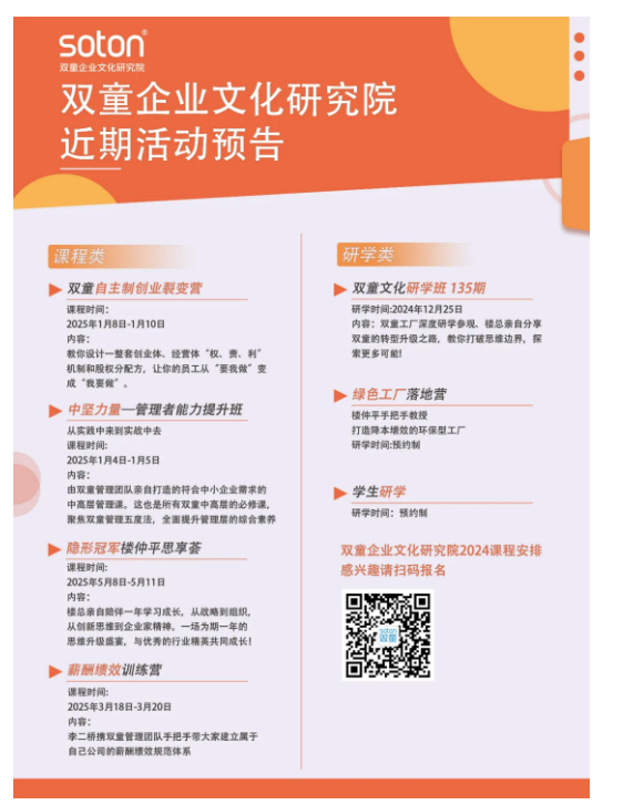 如果你也對(duì)“雙童”充滿好奇,也想賦能團(tuán)隊(duì)共同成長(zhǎng),歡迎走進(jìn)12月25日【雙童文化研學(xué)班】,與上百位優(yōu)秀的創(chuàng)業(yè)者一起學(xué)習(xí)!少量名額,歡迎咨詢鎖定!