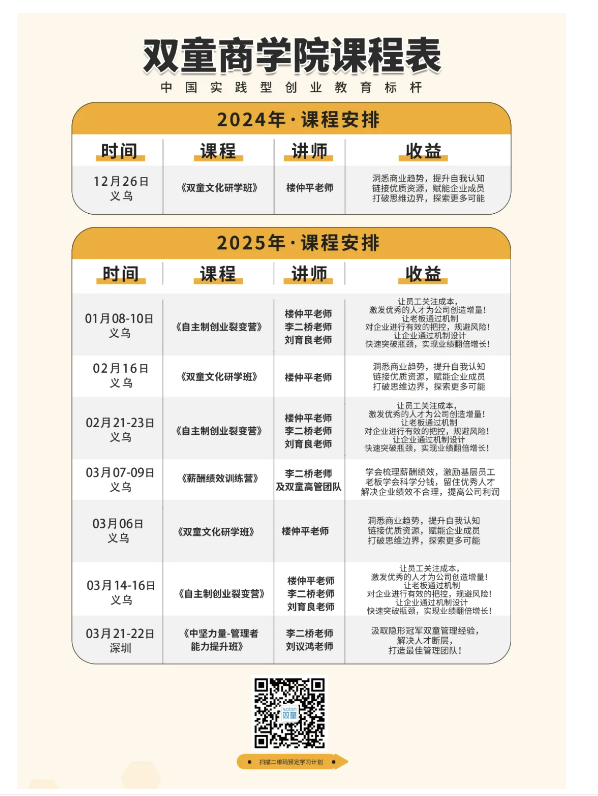 第2425期《自主制創(chuàng)業(yè)裂變營(yíng)》計(jì)劃作為春節(jié)前的收官課程,但很多未報(bào)上名的學(xué)員表示,非常希望能在2025年伊始就為自己企業(yè)搭建一個(gè)可持續(xù)的激勵(lì)機(jī)制,以全新的面貌帶領(lǐng)團(tuán)隊(duì)發(fā)展,所以在學(xué)員們的學(xué)習(xí)熱情下,雙童商學(xué)院特意增設(shè)了1月8號(hào)的《自主制創(chuàng)業(yè)裂變營(yíng)》!
