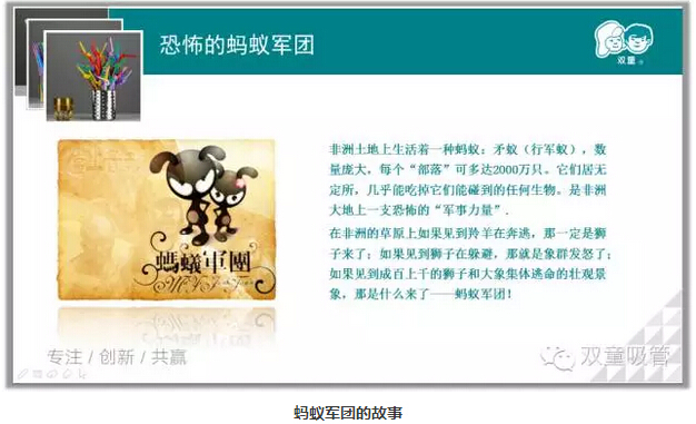 游戲結(jié)束,課程也正式開始啦!妞通過兩個小故事和我們分享了團(tuán)隊(duì)精神,在非洲的大地上有一支恐怖的“軍事力量”——螞蟻軍團(tuán)!成百上千的獅子和大象見到他們就會集體逃命,他們經(jīng)過的地方會寸草不生。一只螞蟻的力量很小,可成千上萬只螞蟻的力量卻是無窮大呀!