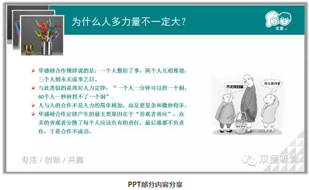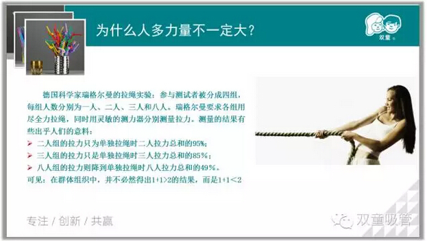 為什么人多不一定力量大呢? 德國科學(xué)家瑞格爾曼的拉繩實(shí)驗(yàn):參與測試者被分成四組,每組人數(shù)不同。測量的結(jié)果顯示人越多,反而拉力總和越小??梢姡涸谌后w組織中,并不必然得出1+1>2的結(jié)果,而是1+1<2。這也是旁觀者效應(yīng),一個人敷衍了事,兩個人互相推諉,三個人則永無成事之日。也就有了三個和尚沒水喝的故事!