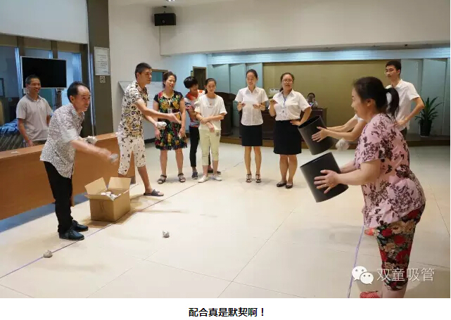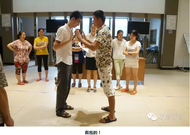 “太極推推樂?”這個游戲是讓每組夫妻派出一人應(yīng)戰(zhàn)。對抗的兩人面對面站立,雙方相互之間輕推對方的手掌,對方的腳最先離開原來站立的點(diǎn),誰就輸了??炜?!我們的妻子們可賣力啦,丈夫們也毫不示弱,場面可真是熱鬧呀!