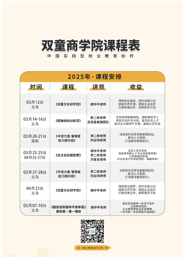 如果你也對“雙童”充滿好奇,也想賦能團(tuán)隊共同成長,歡迎走進(jìn)3月12日【雙童文化研學(xué)班】,與上百位優(yōu)秀的創(chuàng)業(yè)者一起學(xué)習(xí)!少量名額,歡迎咨詢鎖定!