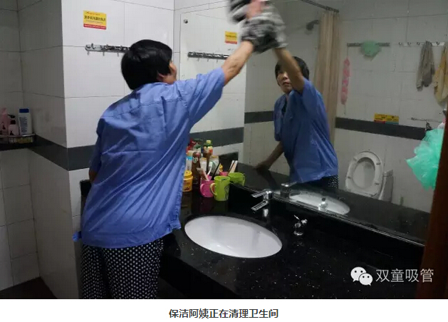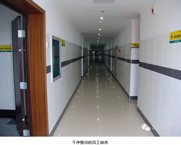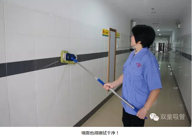 首先吸管妞就從衛(wèi)生保潔工作說起,每天清晨,保潔阿姨就已經(jīng)將員工寢室的通道打掃地干干凈凈了。墻面上的每一塊瓷磚都得用布拖把擦拭干凈,不能留下一點灰塵!