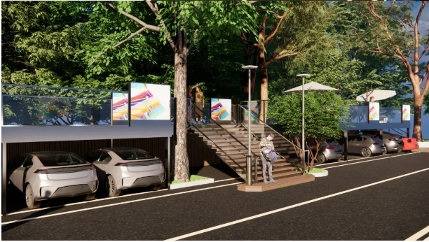 雙童的百米文化長廊對(duì)面正是一片樹林和停車場(chǎng),只需要設(shè)計(jì)一個(gè)懸空走廊,既保住了原有的樹木,還留住了停車場(chǎng)地,又可以有一塊新的員工休閑區(qū),三全其美!