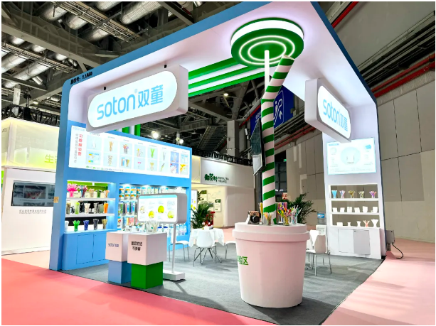 今年的展臺設(shè)計采用了雙童logo的主題色藍(lán)色作為主視覺色調(diào),并融入了現(xiàn)代流線型的設(shè)計風(fēng)格。綠白色的巨型吸管尤為醒目,設(shè)計元素中突顯了雙童產(chǎn)品的環(huán)保理念。