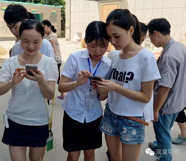 瞧!我們剛開張,就吸引了不少正要去吃飯的員工們。原來,拿到飲料的方法特別簡(jiǎn)單,只需要關(guān)注“雙童吸管”的微信公眾平臺(tái)并轉(zhuǎn)發(fā)微信,即可獲得檸檬氣泡水一袋呢!看來吸管妞為了微信的推廣也是絞盡腦汁啦!
