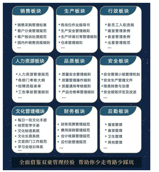 入學(xué)“隱形冠軍樓仲平思享薈”之后,你將獲得“雙童”積累了31年、包含了銷(xiāo)售、生產(chǎn)、行政、人力資源、品質(zhì)、安全、文化管理、財(cái)務(wù)和后勤等9大板塊,近600份管理規(guī)范文件,可以幫助企業(yè)全面借鑒雙童管理經(jīng)驗(yàn)、少走彎路、少踩坑!