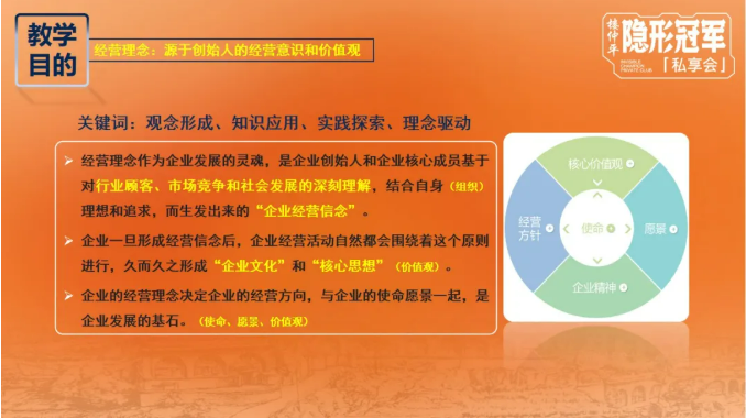 在《經(jīng)營理念與企業(yè)成長》課程交付中,樓老師特別選用他個人的持續(xù)成長和雙童的發(fā)展作為教學(xué)案例,通過剖析他個人的思維認知轉(zhuǎn)變?nèi)绾悟?qū)動雙童經(jīng)營理念的轉(zhuǎn)變,以及帶領(lǐng)企業(yè)一次次穿越周期、韌性成長的故事,讓同學(xué)們更直觀地認識到:創(chuàng)始人的經(jīng)營意識和價值觀是企業(yè)經(jīng)營理念最直接來源。而經(jīng)營理念是企業(yè)發(fā)展的靈魂,決定著企業(yè)的經(jīng)營方向。