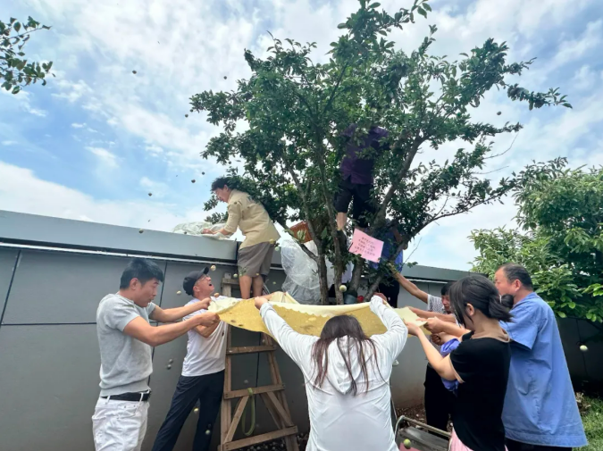 轉(zhuǎn)戰(zhàn)一株臨墻李子樹,我們搬來了梯子采摘,樓總介紹道:“雙童的水果一旦熟了之后,我們就會提醒員工果子已成熟。不折枝,不爬樹,只在樹下品嘗。為什么不讓爬樹?因?yàn)榕虏话踩D阋粋€(gè)人來爬樹,就怕出現(xiàn)安全問題,人多的時(shí)候爬樹也能確保安全?!?/span>借助工具,攀上枝頭,只為得到那一抹甜蜜。這一棵樹臨墻而生,又長的太高,實(shí)在是不好夠到,但也不能這么白白放棄呀,那么好的李,于是大家拿來布,兜在樹下,搖晃樹干,天空下了一場李子雨。大家一邊被“雨”砸得嗷嗷叫,但是又一邊快樂地大笑。沒一會兒的功夫,十幾個(gè)果筐早已被青紅的李子塞得滿滿當(dāng)當(dāng),陽光透過枝葉在果堆上灑下斑駁的光暈,仿佛給這場豐收節(jié)奏上了華彩的樂章。