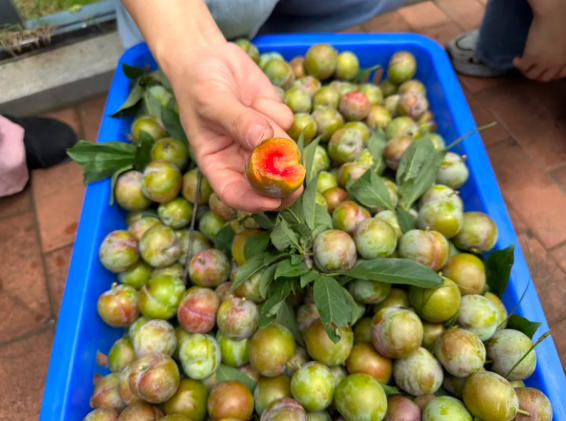 活動剛啟動,人群便沸騰起來:有人架梯登高“強(qiáng)取豪奪”樹頂?shù)?quot;甜蜜果",有人組隊(duì)圍剿低處的"小可愛",更有資深食客現(xiàn)場科普:"果皮帶裂縫的才是‘糖心炸彈’,那種才甜!"歡聲笑語中,竹籃里的李子逐漸堆成小山,甚至李子都快溜出來,裝不下了。