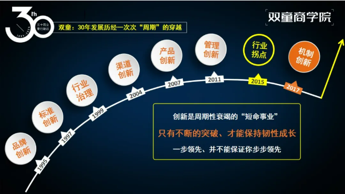 企業(yè)成長的背后是創(chuàng)業(yè)者的持續(xù)成長,雙童能夠一次次成功穿越周期的背后,正是創(chuàng)始人樓仲平個(gè)人持續(xù)成長、自我進(jìn)化、行知合一的結(jié)果!所以每次的分享中,他都將自己47年的持續(xù)成長歷程作為第一篇章內(nèi)容。
