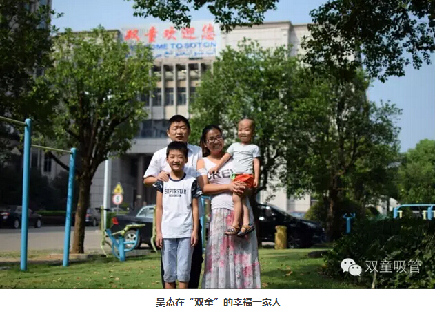 事業(yè)蒸蒸日上的同時,吳杰還有一個幸福的小家庭。2009年,吳杰把老婆呂二燕也接來了“雙童”,在藝術吸管崗位工作。2012年,由于要照顧孩子,老婆呂二燕辭去了工作在家相夫教子。同年,吳杰又喜得一子,一家四口住在公司安排的行政套房內,一家子真正把家安在了“雙童”。
