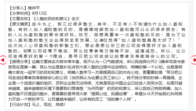 至于品德,只有長(zhǎng)期的考驗(yàn)才能被檢驗(yàn),所以需要通過(guò)價(jià)值觀引導(dǎo)和制度約束來(lái)加以修正。這也是雙童“回歸”盛和塾的意義所在!最后,他在發(fā)言中振臂高呼,鼓舞號(hào)召大家從今天開始放下自己,放下過(guò)往,從“新”開始,追隨塾長(zhǎng)!