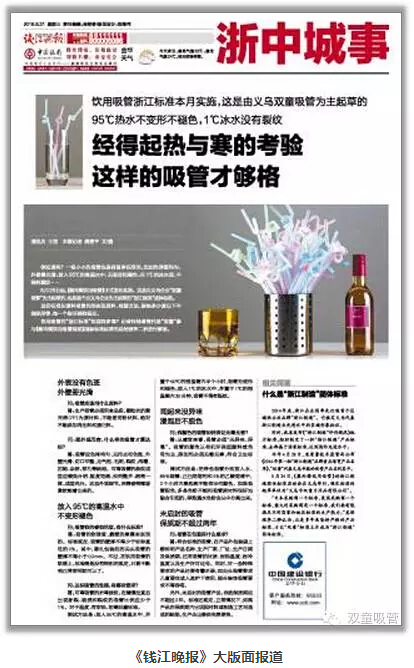 8月26日,由“雙童”主導起草的“浙江制造”團體標準《聚丙烯飲用吸管》正式發(fā)布實施!這份標準從塑料吸管的形態(tài)到原料、檢測方法、耐熱多少度以下不能變形等,每一個細節(jié)都有明確的規(guī)定。消息一出,引起了新聞媒體的高度關注。這不,浙江的權威媒體《錢江晚報》對此也進行了大版面報道,下面妞就帶大家來看看吧!