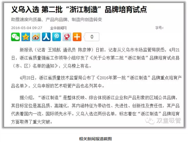 今年4月28日,省質量技術監(jiān)督局公布《2016年第一批“浙江制造”品牌重點培育產品名單》,“雙童”代表義烏申報的吸管產品名列其中。