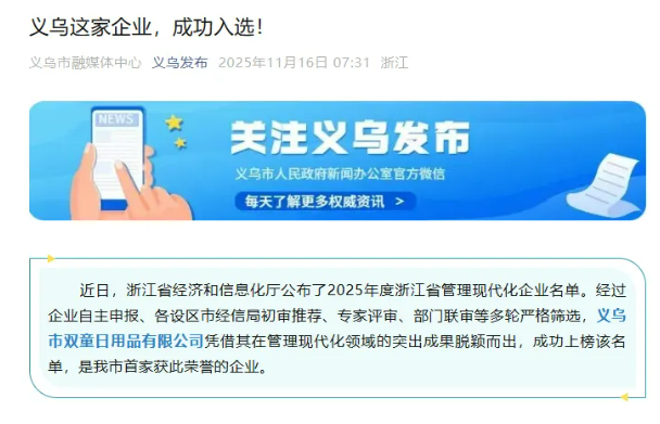 近日,義烏市雙童日用品有限公司成功入選“2025年度浙江省管理現(xiàn)代化企業(yè)”,成為義烏市首家獲此榮譽的企業(yè)。該消息由《義烏發(fā)布》隆重報道!
