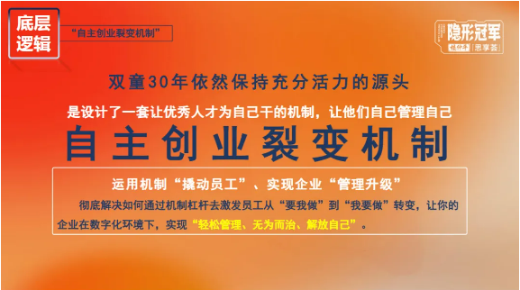 然而,傳統(tǒng)管控模式難以適應(yīng)新階段需求,而市面上成熟機制多基于大企業(yè)邏輯,無法直接適用于雙童。面對核心員工流失與資源閑置的雙重困境,他基于“以機制撬動人效”的思路,在數(shù)字化環(huán)境下創(chuàng)新組織架構(gòu),探索出《自主創(chuàng)業(yè)裂變機制》,開展了一場立足中國中小企業(yè)現(xiàn)實的組織創(chuàng)新實踐。