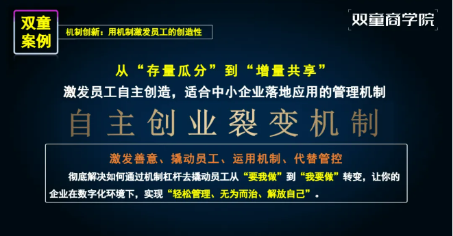如今,歷經(jīng)數(shù)年實踐,雙童自主創(chuàng)業(yè)裂變機(jī)制已日趨完善,通過資源配置和分配機(jī)制的創(chuàng)新,幫助企業(yè)實現(xiàn)了與員工間從存量瓜分博弈到增量共享的轉(zhuǎn)變。