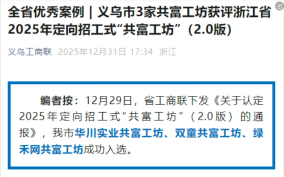 近日,雙童的共同富裕模式再受表彰,成功入選“浙江省2025年定向招工式'共富工坊'(2.0版)”!據(jù)悉,義烏市獲此榮譽的企業(yè)僅三家。