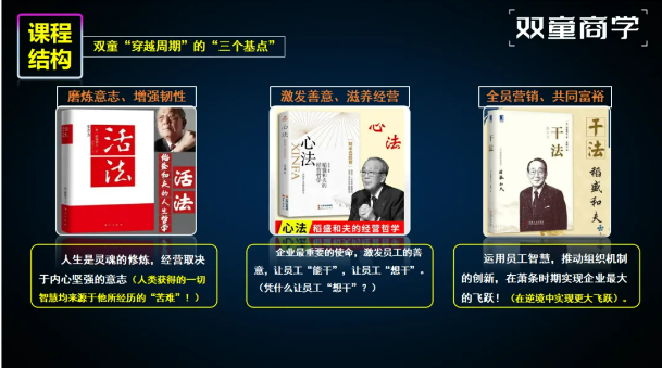 樓仲平在分享伊始,便向在座塾生們提出雙童“穿越周期”的三個基點:磨煉意志、增強韌性;激發(fā)善意、滋養(yǎng)經(jīng)營;全員營銷、共同富裕。這三者相互支撐,形成了他獨特的經(jīng)營哲學。