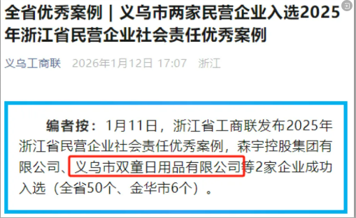 近日,浙江省工商聯(lián)正式發(fā)布2025年浙江民營企業(yè)社會責任報告優(yōu)秀案例名單,雙童憑借在綠色發(fā)展、共同富裕和公益慈善等領(lǐng)域的扎實實踐,成功入選“2025浙江民營企業(yè)社會責任優(yōu)秀案例”,成為義烏唯二的入選企業(yè)!